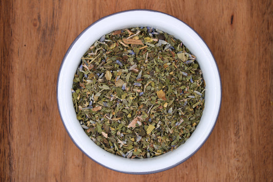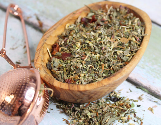 Our Happy Vibes Tea is a wonderful, minty tea with medicinal herbs known for their ability to promote mood improvement and aid energy levels.